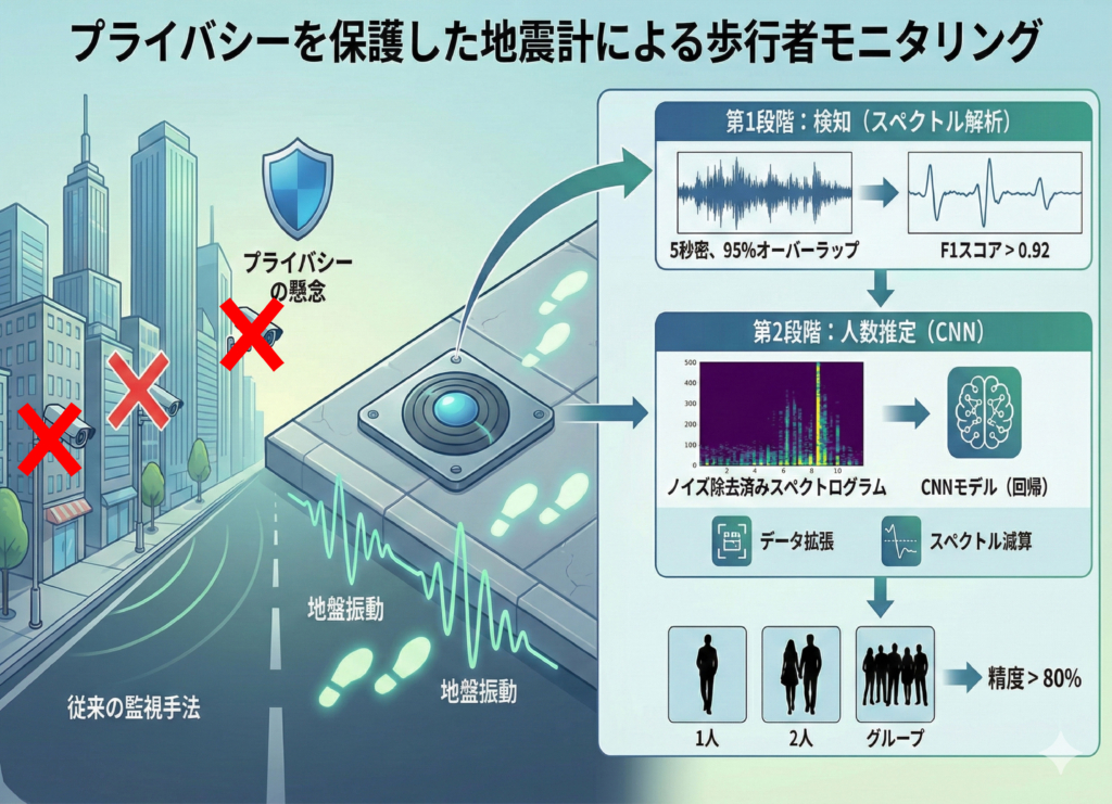 地面の揺れだけで人の流れを捉える : 単一の地震計で歩行者数を推定するプライバシー保護型人流モニタリング技術